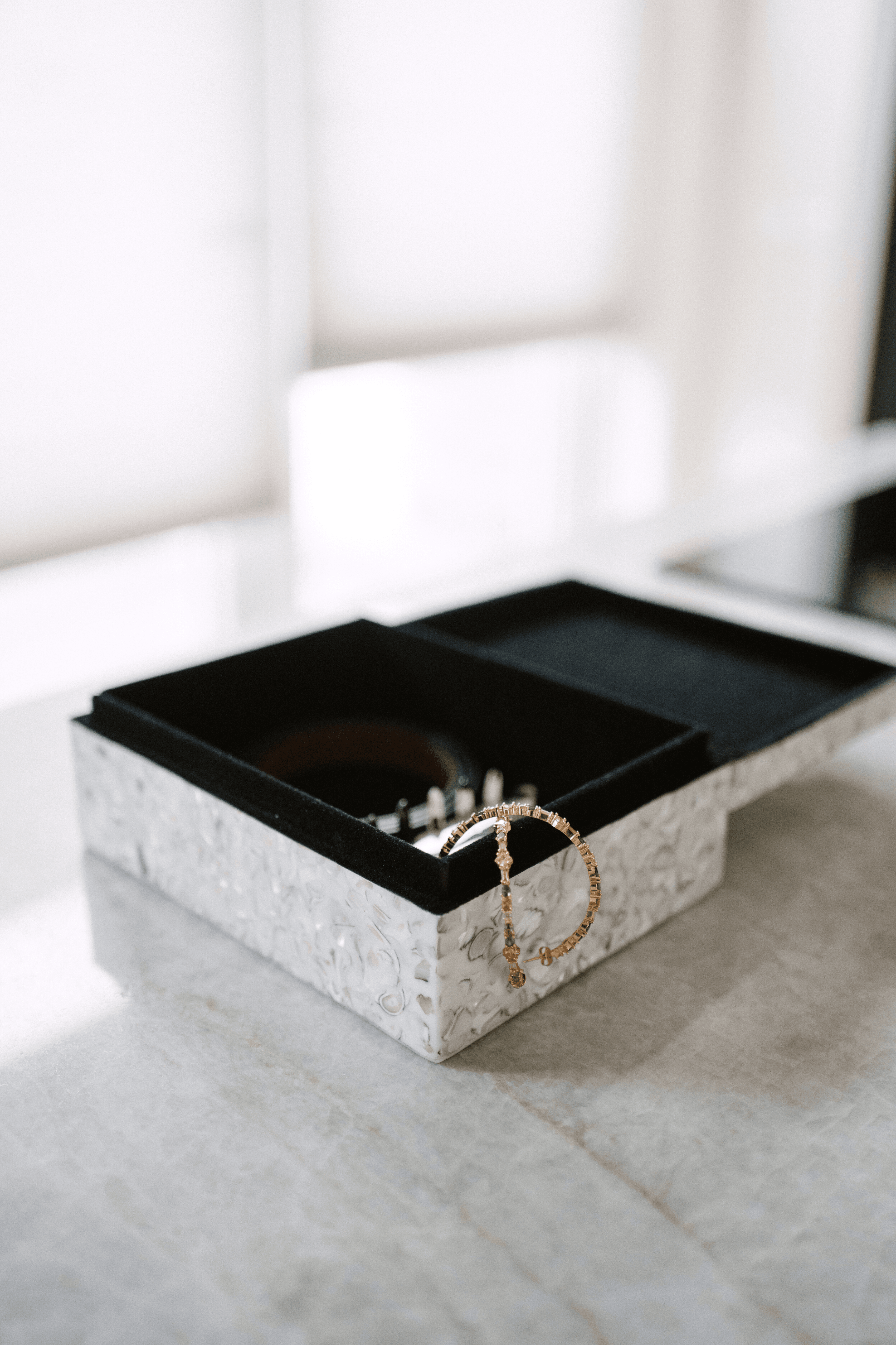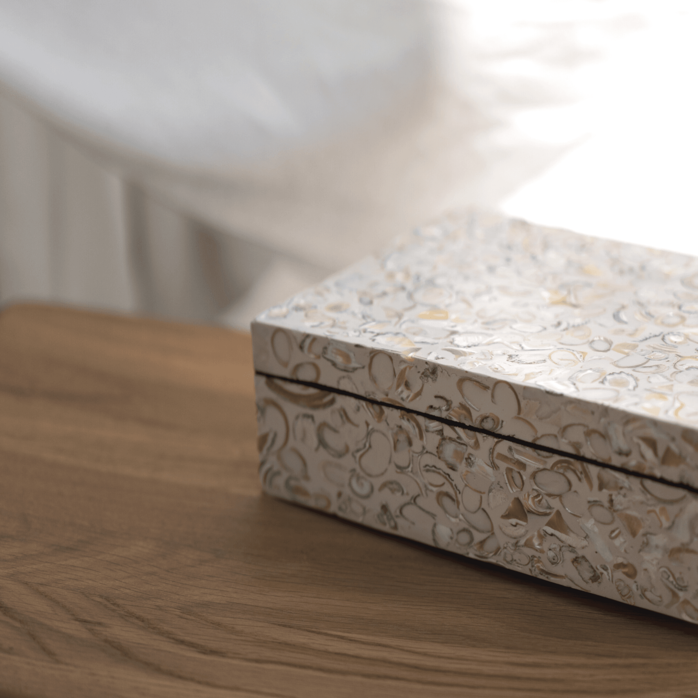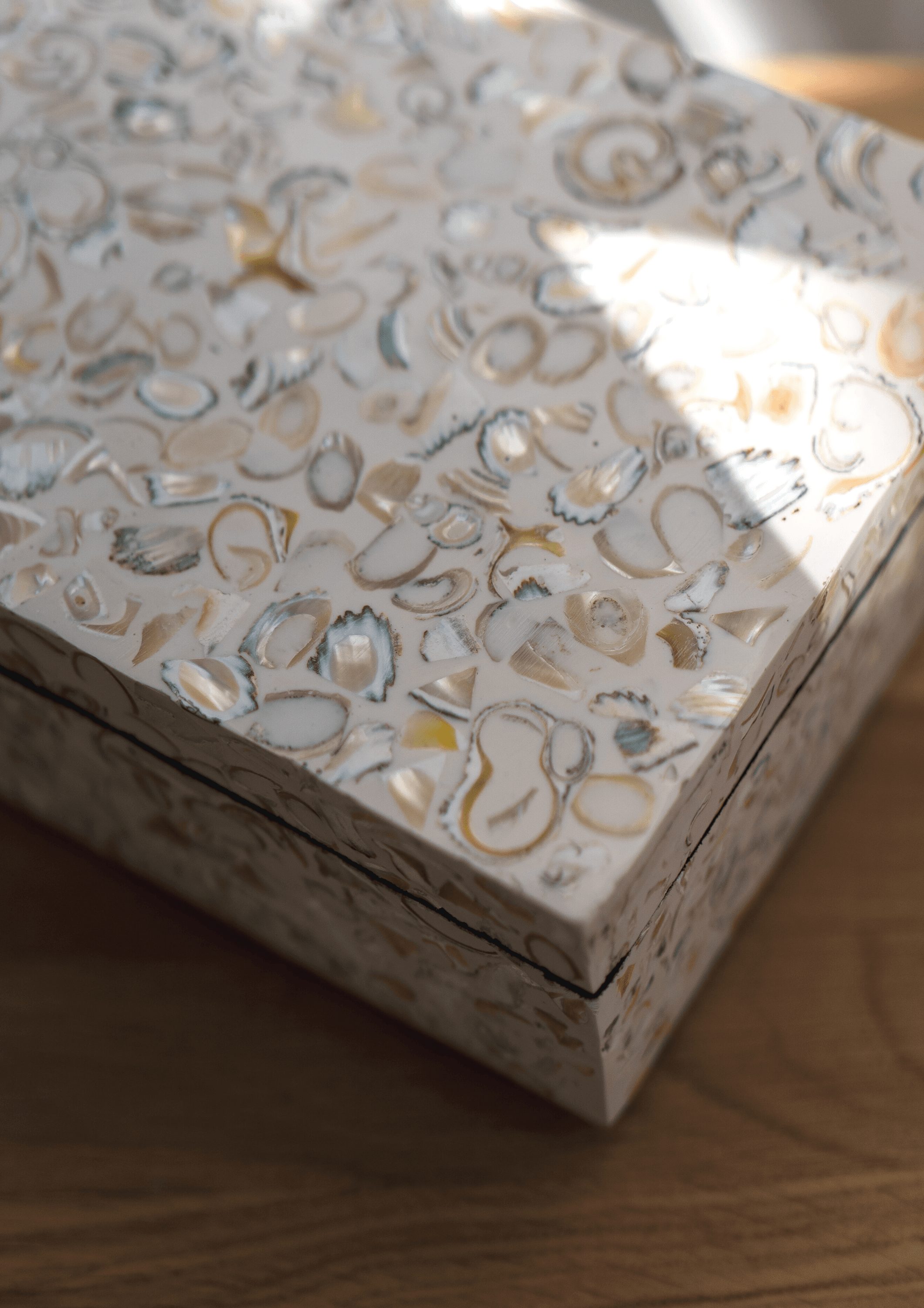 De opbergdoos is gemaakt van parelmoer gecombineerd met hars, handgemaakt in Bali.