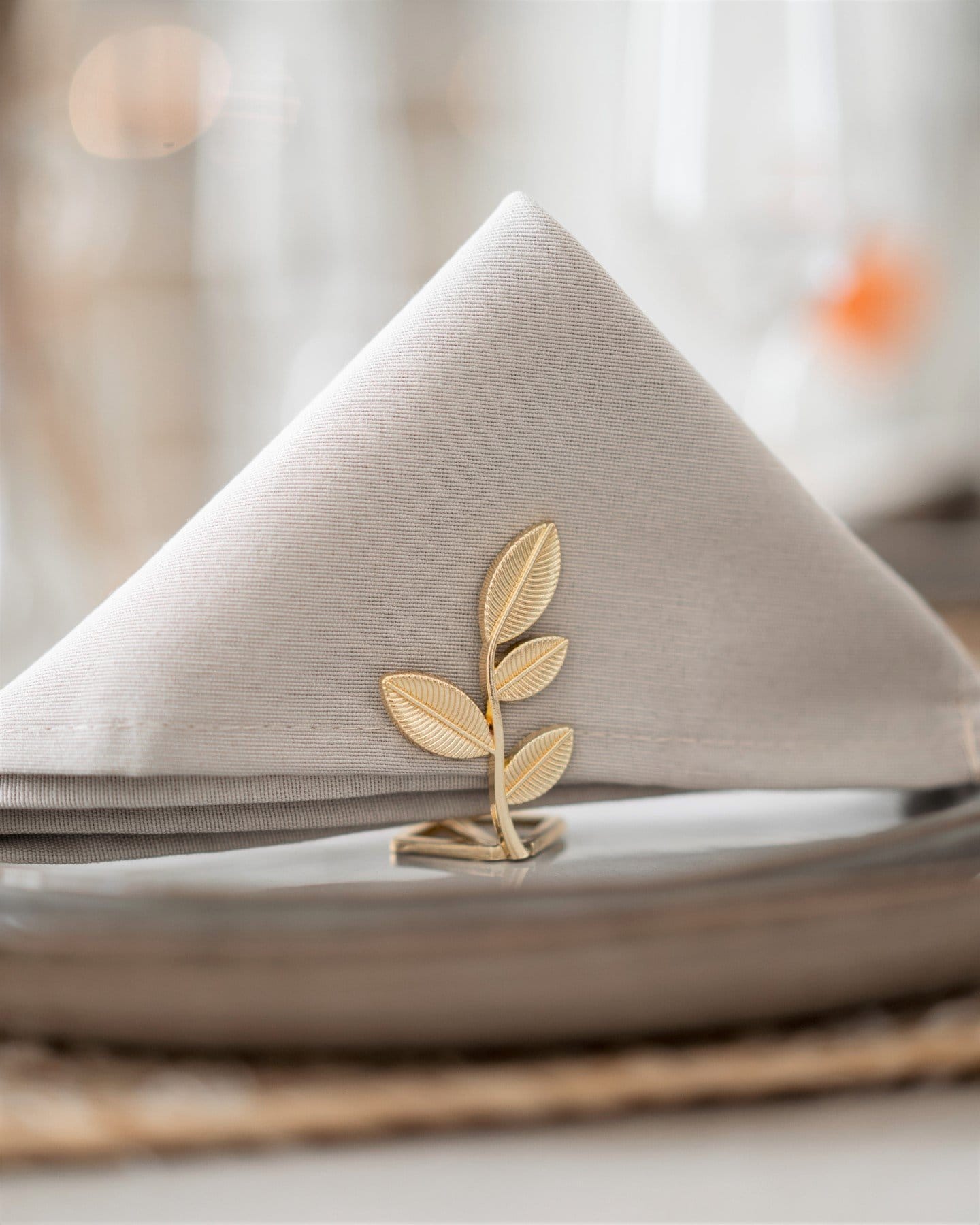 Gouden servetring in de vorm van een ash leaf, handgemaakt in India.